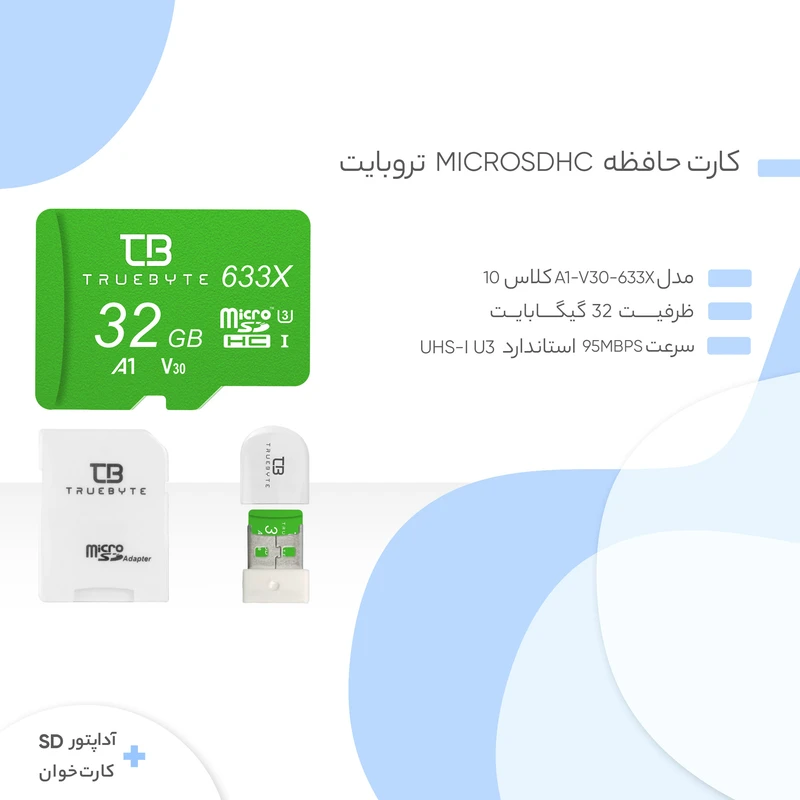 کارت حافظه microSDHC تروبایت مدل A1-V30-633X کلاس 10 استاندارد UHS-I U3 سرعت UHS-I U3 سرعت 95MBps ظرفیت 32 گیگابایت به همراه آداپتور SD و کارت خوان
